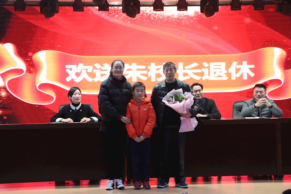 本次大会还有一项特别议程——全体教职工欢送朱校长光荣退休。学校工会特邀教师代表——朱杜鹃(朱校长女儿)致颁奖词,郭校长充分肯定了朱校长对郭小教育事业的付出,并颁发纪念奖牌,全体教职工用热烈的掌声欢送朱校长光荣退休。